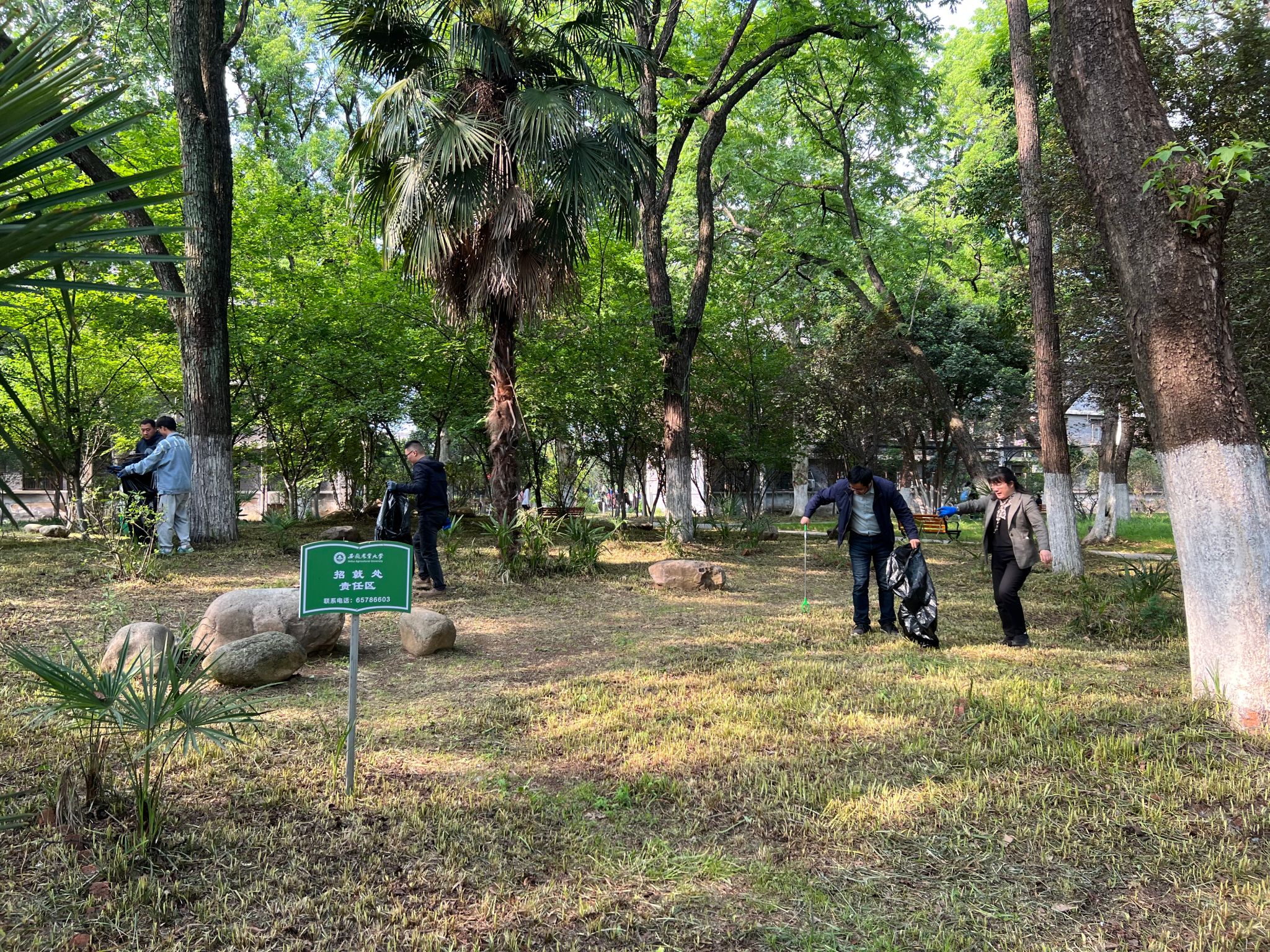 招就处部支部党员在支部书记的带领下,戴着手套、扫把、钳子和垃圾袋,两三人一组,分工明确,配合默契,深入责任区的每个角落,对责任区内垃圾,包括杂草、树叶等进行彻底清理,并对办公室内部环境进行了大清扫。