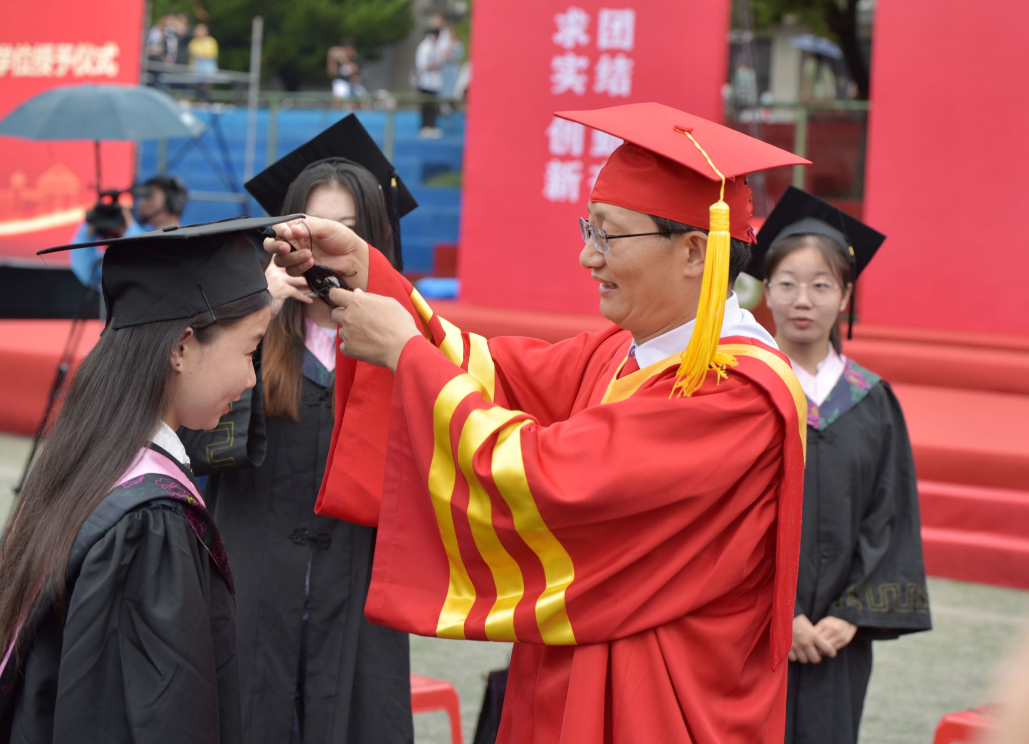 随后,导师团走入学生中,冒雨为同学们正冠拨穗并合影留念。