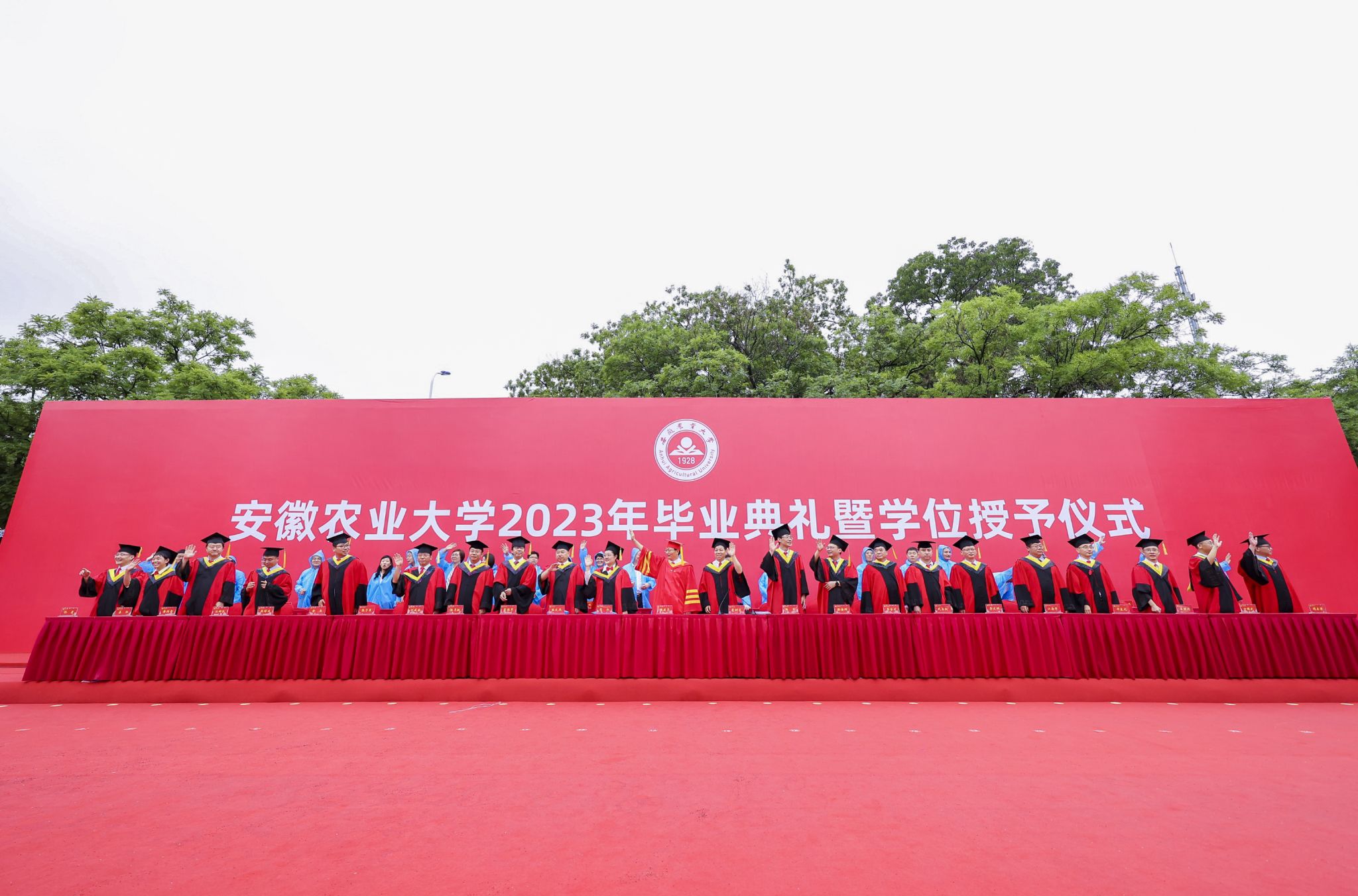 典礼结束时,主席台领导全体起立,与毕业生挥手告别,目送同学们离场,祝福大家一路顺风、一生幸福。