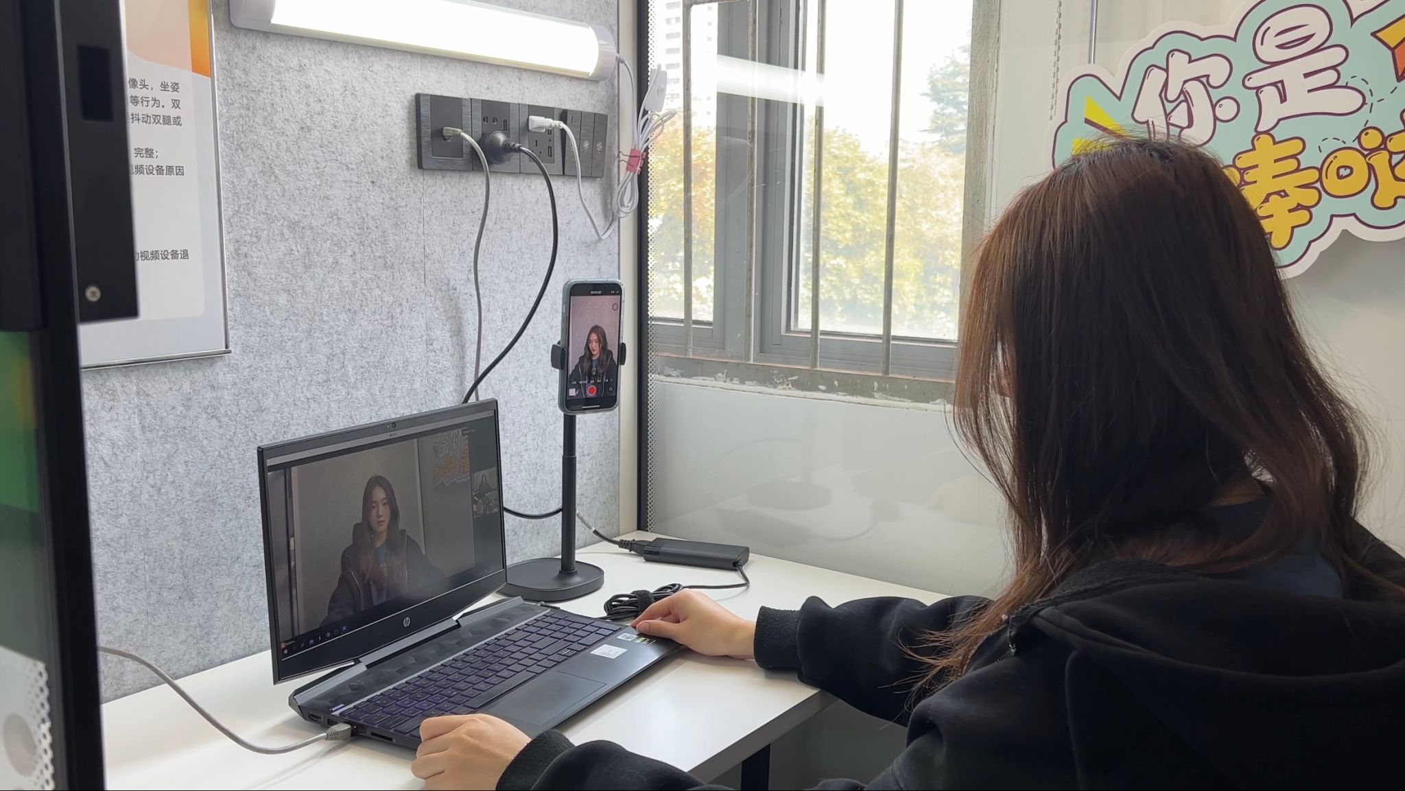 “线上面试亭”位于校欣苑三楼学生服务中心内,毕业生可以根据面试时间,通过智慧安农面试亭预约系统提前预约,并凭借电子密码自行进入。面试亭内桌椅、顶灯、补光灯、手机支架、USB接口、插座、网络接口、通风设备等一应俱全,隔音板有效隔绝外界干扰,玻璃门上的遮光贴纸有效保护隐私,整体环境舒适私密,有利于毕业生的面试发挥。