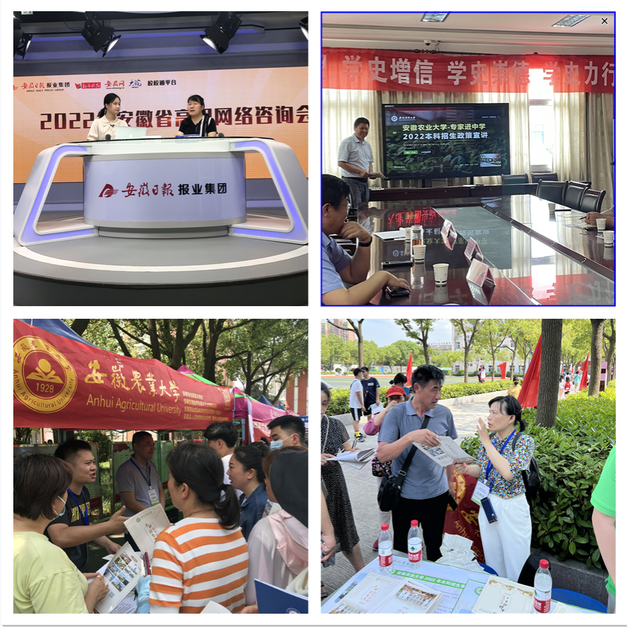 学校充分利用 6月24日—30日高考志愿填报黄金时期,培训选派全校招生骨干教师合计16组40余人参加全省90余所省级示范中学高招咨询会。在各咨询会现场,宣传队工作人员不辞辛劳,顶高温,冒酷暑,热情、耐心地解答现场考生和家长关注的热点问题。学校还积极利用各类公共媒体开展招生宣传,先后参加中央广播电视总台农业农村节目中心“2022年高考报考(农科)专业指南”融媒体直播,安徽省考试院大型直播咨询会、安徽日报高招咨询会、中安在线高考直通车、市场星报高招直播咨询等电视、网络直播咨询会,向广大考生及家长详细解读了我校的各项招生政策,帮助考生、家长更为合理的填报志愿,进一步提升了我校吸引力和社会知名度。