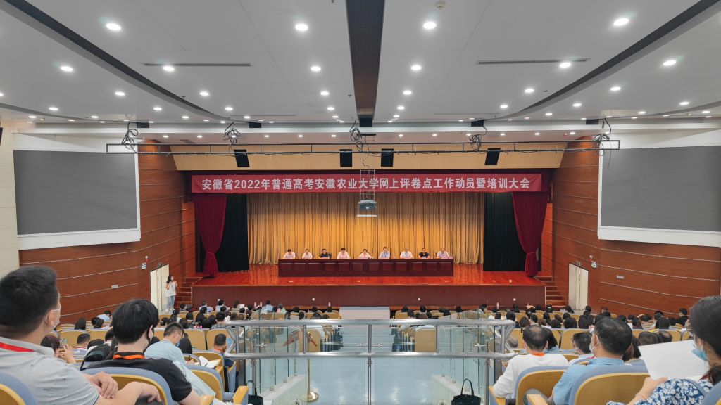 本网讯6月11日上午,安徽省2022年普通高考外语科目网上评卷动员暨培训大会在我校图书馆第一报告厅召开,这是安徽省普通高考实行网上评卷以来,我校连续第十七年承担此项任务。校党委常委、副校长韩军,省教育招生考试院副院长阮怀忠出席会议并讲话,评卷专家及教师近440人参加会议,大会由校党委常委、副校长李红主持。