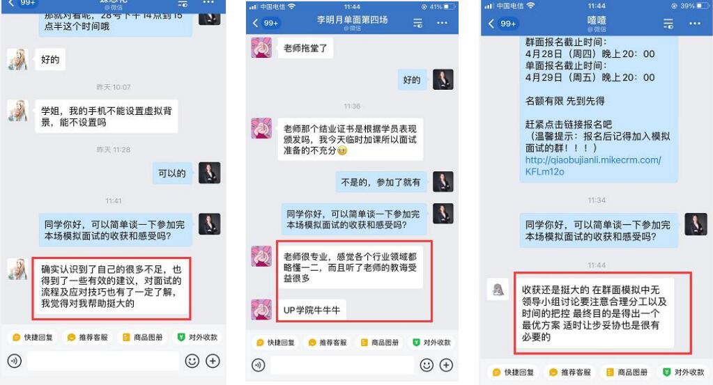 本次线上求职实战营活动共为期8天,活动包括简历制作、面试指导、职场礼仪、职业探索等在线课程学习及简历点评、单面、群面模拟训练等实战教学。在视频课程学习过程中,同学们在活动过程中积极参与,不仅课程打卡互动完成率保持在90%以上,还在学习社群内踊跃分享自己的学习感受。单面模拟训练还原了真实的面试环境,由导师对学生进行一对一的面试点评,同时对同学们的求职困惑进行解答,帮助大家理清个人职业规划。群面模拟训练采用无领导小组讨论形式,在讨论后由导师对每位同学在团队中的作用与贡献进行点评,帮助大家迅速提升面试能力。根据活动调查满意度问卷显示,大部分同学都对本次活动满意度较高,活动取得了理想的效果。