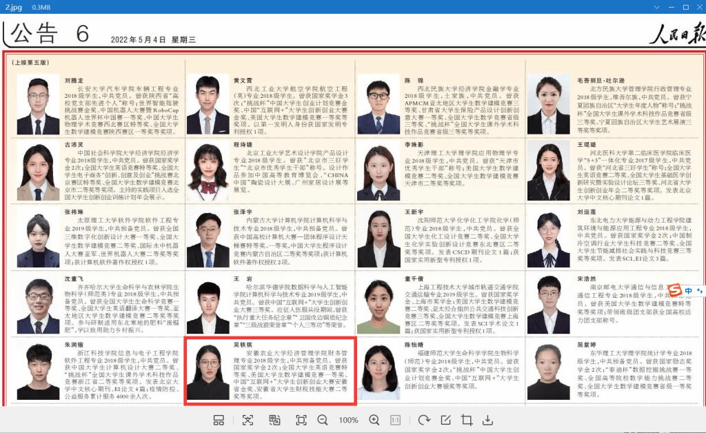 本网讯 5月4日,《人民日报》(2022年05月04日第五、第六版)刊发了《2020-2021学年度本专科生国家奖学金获奖学生代表名录》,名录中展示的100名学生是全国6万名荣获2020-2021学年度国家奖学金本专科学生中的优秀代表。我校吴轶祺同学是安徽省本专科高校唯一入选的获奖代表,这也是我校学子在近三年内的第二次入选。