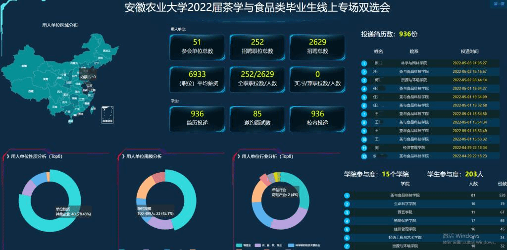 学院党政领导高度重视,充分研判就业形势,精心筹备空中双选会,学院教师和优秀校友积极助力,推荐优质企业报名参加,提供就业岗位。本次双选会精心筛选了51家优质用人单位,提供了252个招聘岗位,需求人数2629人。合肥伊利乳业有限责任公司、谢裕大茶叶股份有限公司、福建茶叶进出口有限责任公司、上海市白茅岭农场有限公司、华润雪花啤酒(中国)有限公司、杭州艺福堂茶业有限公司等知名用人单位纷纷参会,本场双选会页面浏览量达23850次,本校学生在线投递简历936份。