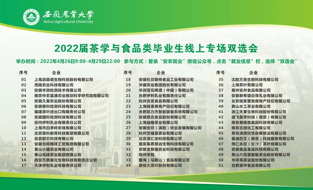 本网讯 为做好疫情防控期间毕业生就业工作,搭建毕业生与用人单位双选交流平台,推进毕业生顺利就业、高质量就业,4月26日-4月29日,茶与食品科技学院举办2022届茶学与食品类毕业生空中双选会。