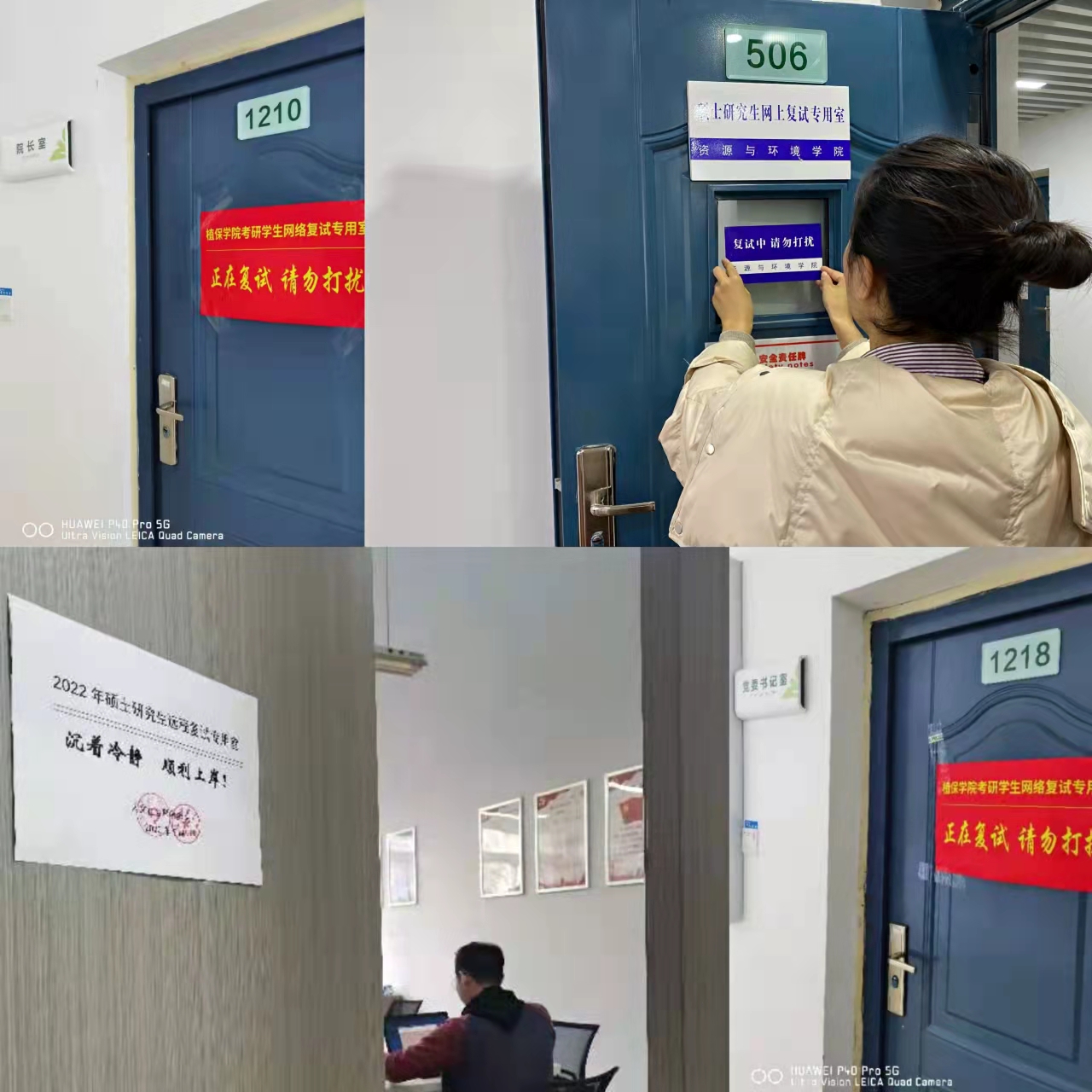 “正在复试,请勿打扰!”等醒目的提示牌默默守护着复试学生的梦想。针对不同考生不同时段的面试空间需求,各学院尽全力调动一切可用资源,为学生参加复试保驾护航。学院办公室、会议室、党员活动室、就业洽谈室、心理咨询室等办公场所纷纷成为学生的“考场”。