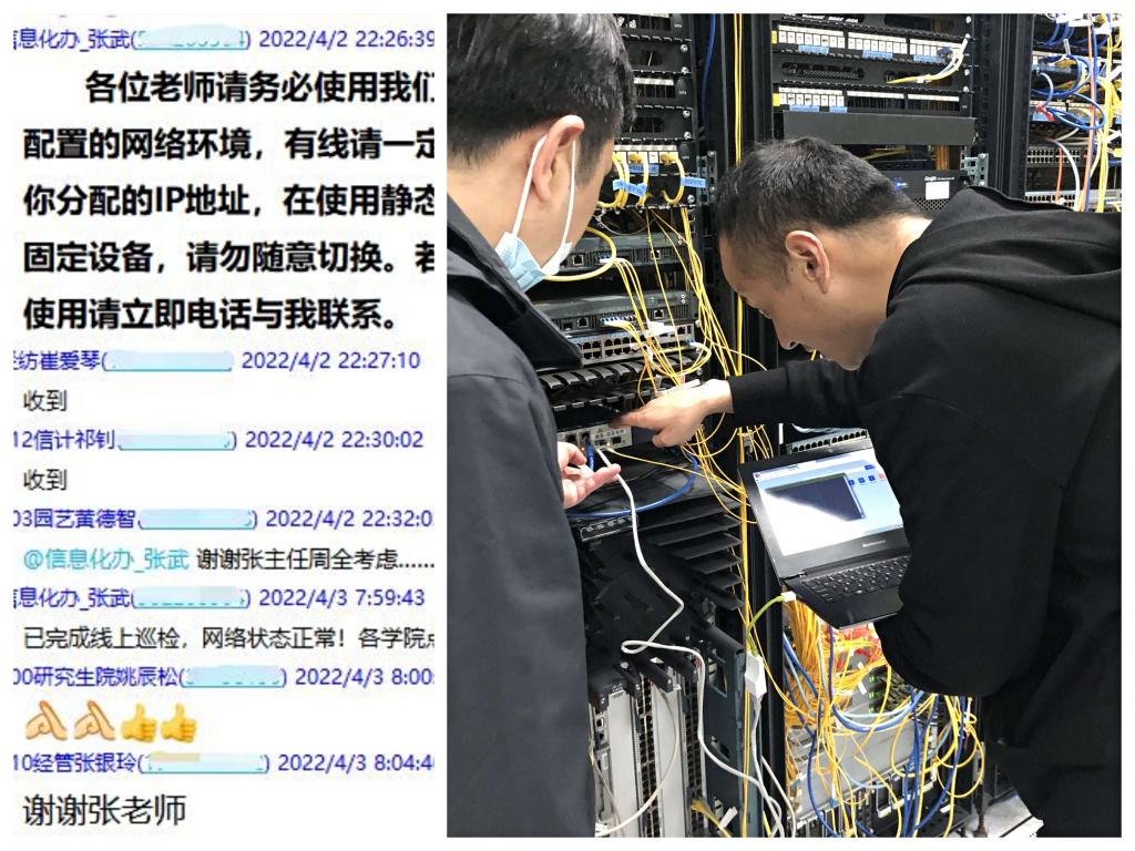 “各位老师请务必使用我们巡检时给您配置的网络环境,有线请一定使用我们给你分配的IP地址,勿随意切换。若切换后无法使用请立即电话与我联系。”晚上十点半信息办张武老师还在办公室为第二天的复试做准备。各学院研究生秘书很快在QQ群里回复:收到!收到。早上八点,张武老师已提前完成网络巡检并在QQ群说道“已完成线上巡检,网络状态正常!各学院有问题请及时反馈”。后勤保障处提前对复试教室的电力电路进行排查,全力确保复试期间电力稳定运行。