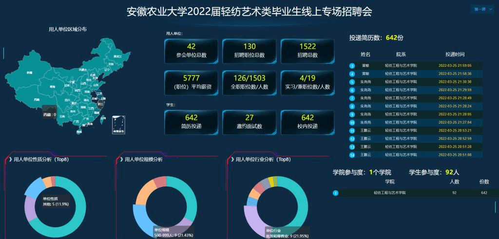 本网讯 为最大限度降低疫情防控给毕业生就业工作带来的影响,3月23日至3月25日,轻纺工程与艺术学院举办2022届轻纺艺术类毕业生线上专场招聘会,来自省内外42家用人单位参与招聘,提供就业岗位数1522个,基本覆盖学院所有专业。
