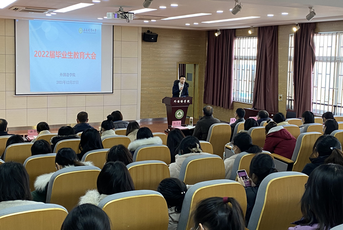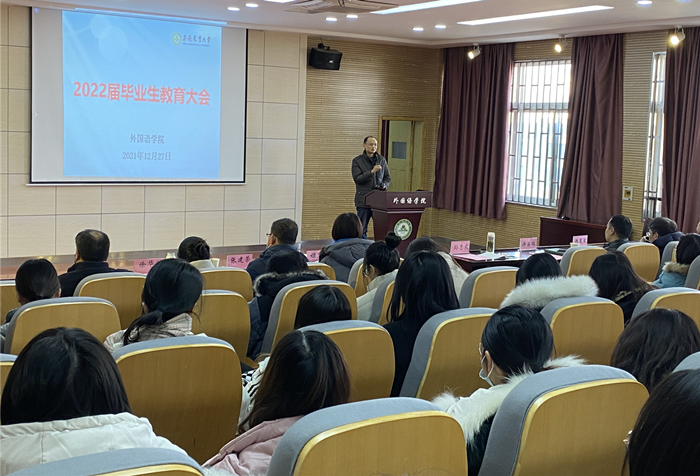 为扎实做好2022届毕业生工作,12月27日下午,外国语学院在外语楼502报告厅召开2022届年毕业生教育大会。学院院长孙志农、副院长许宗瑞、各系主任、毕业班班主任、企业代表和全体毕业生参加大会,会议由学院党委副书记姬惠惠主持。