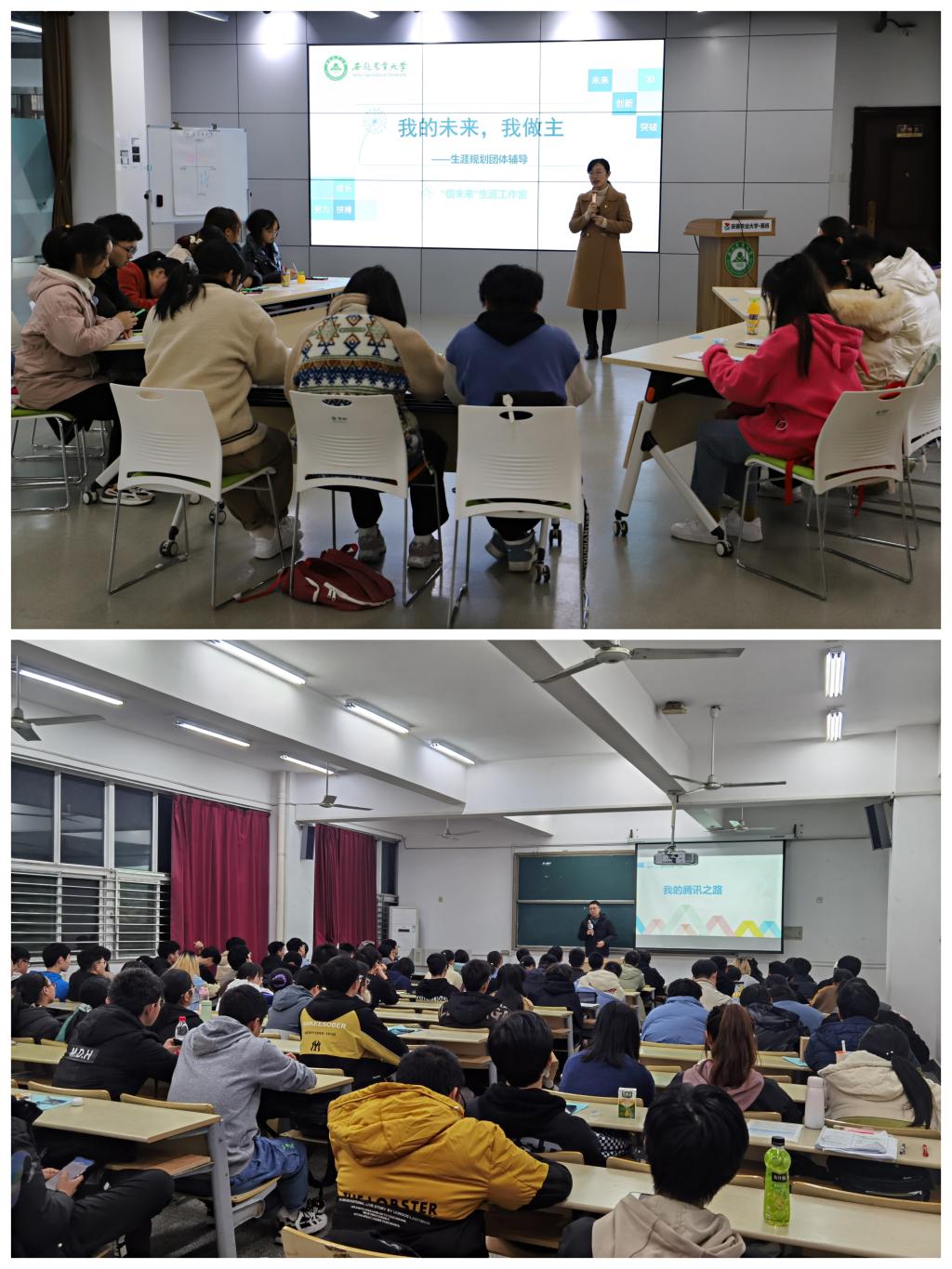 他山之石,可以攻玉。12月7日,“信未来”生涯工作室指导老师陈晓玲在易班中心开展一场“我的未来,我做主”生涯规划主题团体辅导,通过分析职场环境、“十年后的名片”、“大学生活平衡单”等活动,帮助同学们树立生涯目标,激发规划与行动。12月10日,学院邀请到2022届计算机科学与技术研究生彭旭,在经技楼105教室开展了一场“我的腾讯之路”主题分享。彭旭结合自己的经历,就考研的院校选择、如何进入互联网头部企业等方面,分享了他成功入职腾讯的历程,并与现场同学进行了互动和交流。现场气氛热烈,同学纷纷表示受益匪浅,不仅帮助大家明确了努力的方向,更是极大的鼓舞了同学们奋进的斗志。