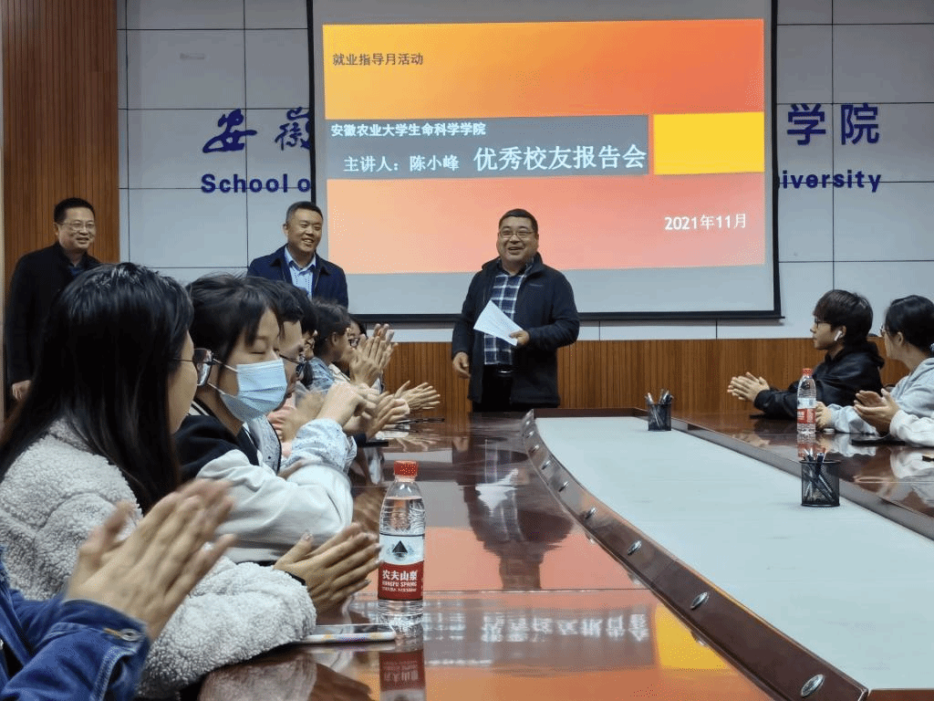 2002届生物技术专业校友、安徽贝金基因科技有限公司副总经理陈小峰应邀出席优秀校友报告会,幽默不失严谨地讲述了自己在校园生活及工作中的感悟,分享了迎难而上、永不服输、奋勇争先的职场打拼经验;工作后仍坚持深造并考取安徽农业大学生命科学学院生物学博士生的心路历程。他鼓励学弟学妹们要设定目标、树立梦想,并踏实勤勉的为之付出,珍惜当下,勿留遗憾。