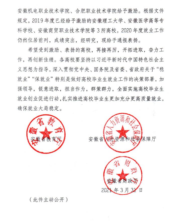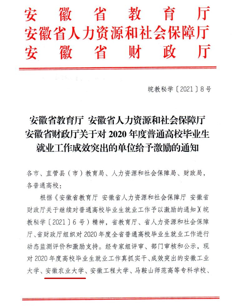 6月4日,安徽省教育厅、安徽省人力资源和社会保障厅、安徽省财政厅联合下发了《关于对2020年度普通高校毕业生就业工作成效突出的单位给予激励的通知》,我校获2020年度毕业生就业工作成效突出单位荣誉称号,获激励资金50万元,全省共激励表彰高校6所(其中本科高校3所)。