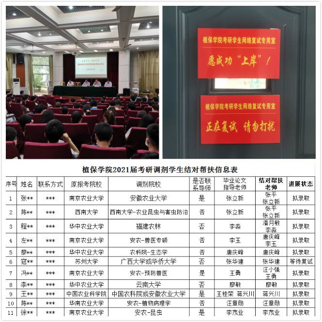 本网讯 近日,随着全国硕士研究生招生工作接近尾声,植物保护学院2021届考研毕业生捷报频传,考研成功拟录取学生116人,全院考研录取率高达58.88%,其中2017级植物保护专业60.83%、2017级动植物检疫专业60.53%,录取院校覆盖浙江大学、中国科学技术大学、南开大学、东南大学等众多知名院校,录取率和录取院校层次再创新高。