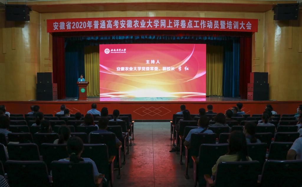 本网讯 7月11日上午,安徽省2020年普通高考外语科目网上评卷动员暨培训大会在我校大礼堂召开,这是安徽省普通高考实行网上评卷以来,我校连续第十五年承担此项任务。校党委常委、副校长李红主持会议,校党委常委、纪委书记陈文兵,省教育招生考试院副院长胡雨生出席会议,评卷专家及教师共430多人参加会议。