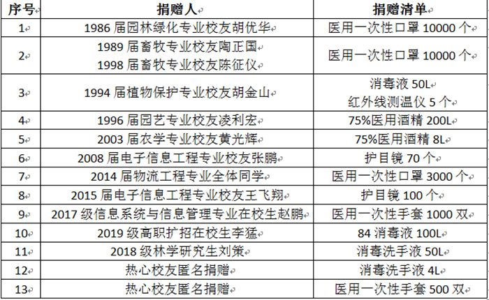 继前期接收到众多校友的捐赠后,3月20日,校友会又收到1989届畜牧专业、广东校友分会会长、广州立达尔生物科技股份有限公司董事长陶正国和1998届畜牧专业校友、广东校友分会秘书长、广州市信农生物科技有限公司总经理陈征仪共同捐赠的医用一次性口罩10000个。截至目前,校友会已共计收到来自广东、云南以及省内各地热心校友捐赠的医用一次性口罩23000只、75%医用酒精208L、消毒液150L、医用一次性手套1500双、护目镜170个、消毒洗手液54L、红外线测温仪5个。这些防疫物资,有的是以校友个人名义捐赠,有的是以班级名义集体捐赠,每一份捐赠都是校友对母校深厚情谊的炙热见证,在接受捐赠的过程中,我们常常被校友们深情的话语感动着: