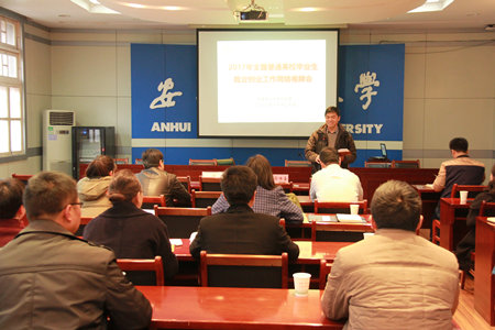 本网讯 11月30日,2017年全国普通高校毕业生就业创业工作网络视频会议在京召开, 教育部党组书记、部长陈宝生出席会议并讲话。我校在勤政楼第二会议室设立了分会场,副校长马传喜出席会议。校毕业生就业工作领导组成员、学院就业工作负责人、就业联络员和毕业班班主任代表等共计50余人参加了会议。副校长姚佐文作为高校代表在省教育厅参加了安徽省分会场会议。
