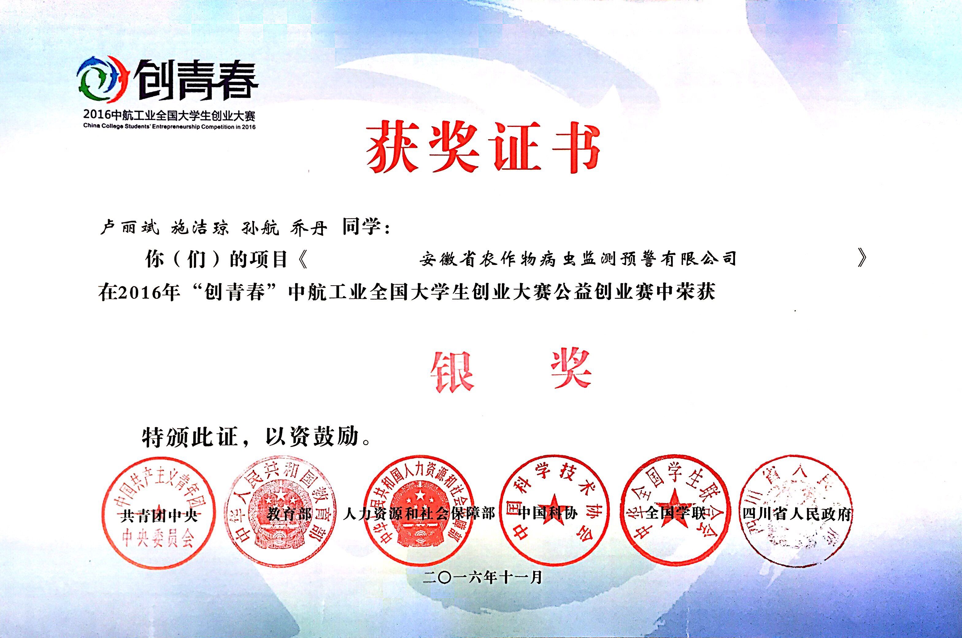 本网讯 11月19日,为期五天的2016年“创青春”全国大学生创业大赛终审决赛在电子科技大学落下帷幕,由我校植物保护学院丁克坚、丁朝阳老师指导的卢丽斌、施洁琼、乔丹等同学的公益创业赛作品《安徽省农作物病虫监测预警有限公司》荣获银奖。大赛期间,团中央书记处书记傅振邦到我校作品展位听取了参赛学生对项目的相关介绍。