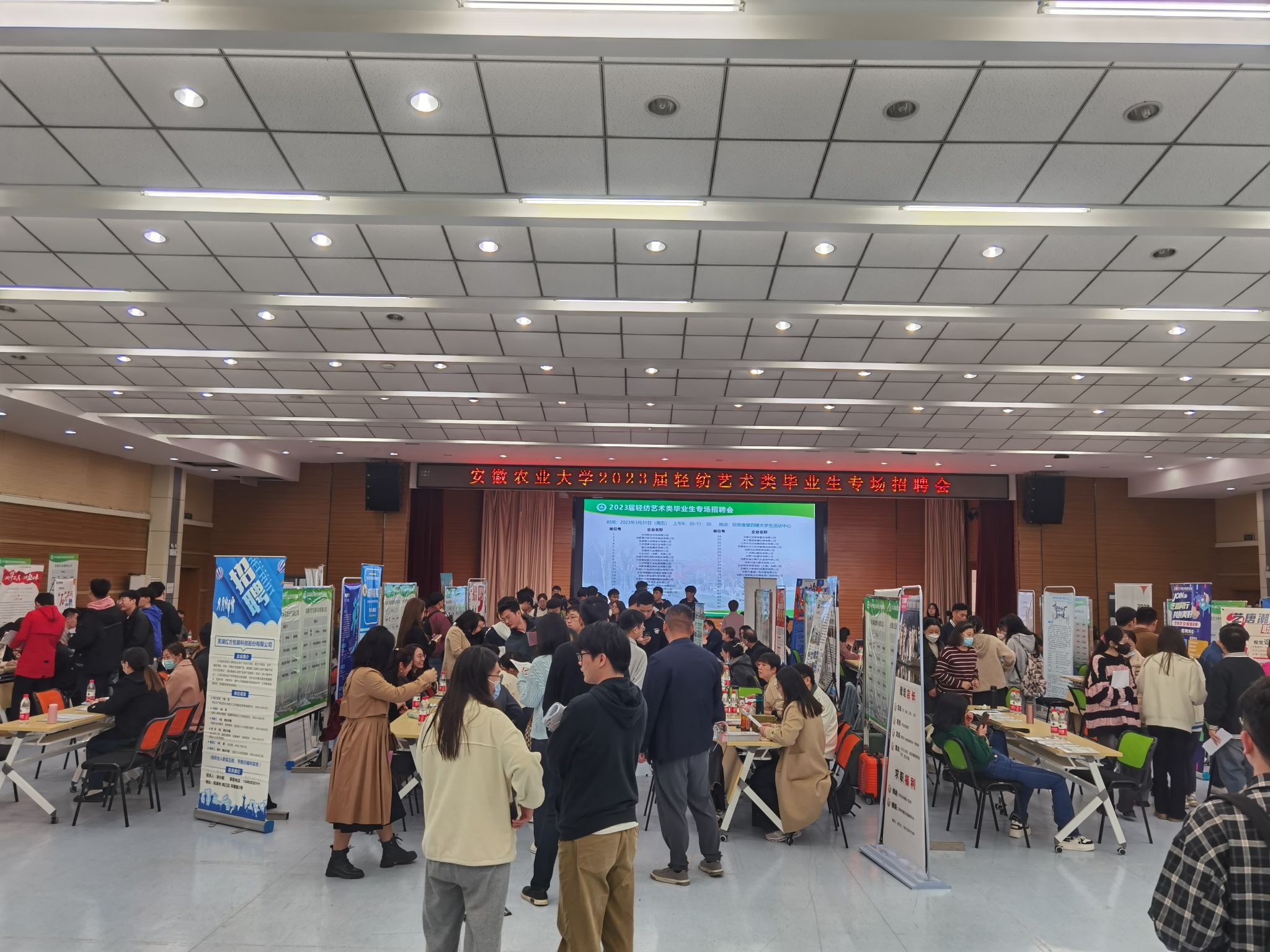 招聘会现场人头攒动,气氛热烈,毕业生们拿着自己精心准备好的简历,积极主动与用人单位交流,详细了解单位的基本情况和招聘岗位信息。本次招聘会邀请到江苏国泰华盛实业有限公司、安徽省徽商集团化轻股份有限公司、安徽华茂集团有限公司等省内外47家优质企业到场招聘,提供岗位需求762个,覆盖轻纺工程与艺术学院所有专业,共吸引400余名学生现场参会求职。