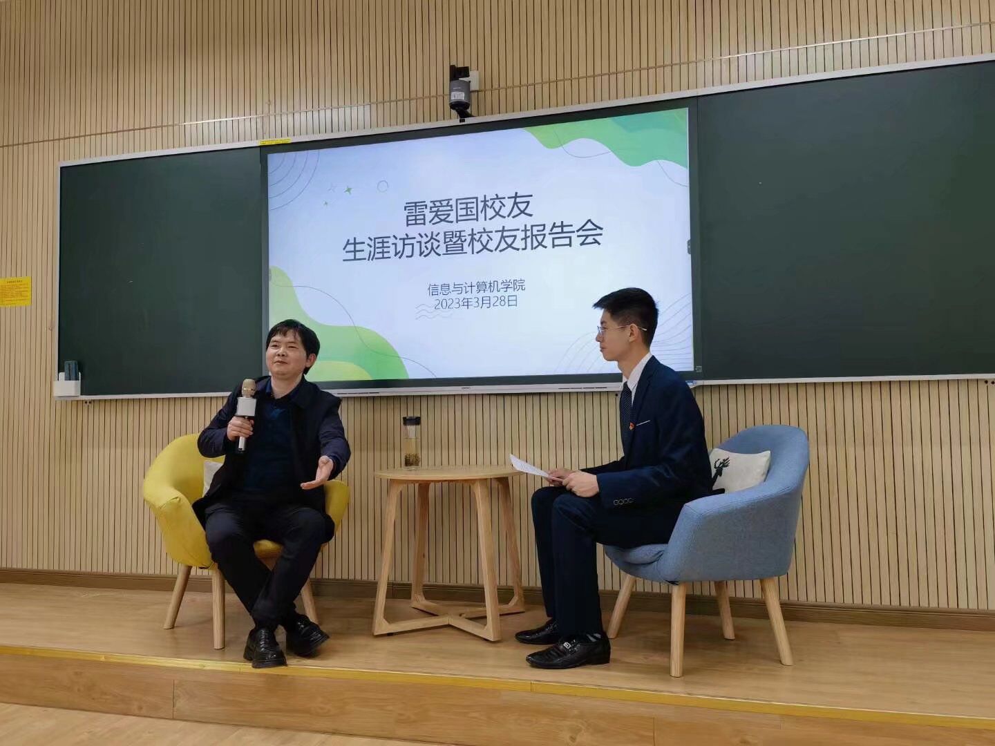 本网讯 3月28日下午,信息与计算机学院在经技楼305举办了一场校友企业家生涯访谈暨校友报告会。本期嘉宾为1998届计算机科学与技术专业校友、合肥网诚智能电子技术有限公司总经理雷爱国,学院党政主要领导、教师代表、来自各年级的学生代表参加了报告会。