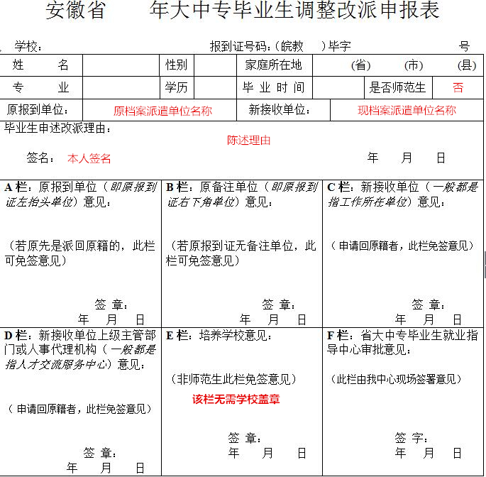 携带材料:原报到证、《安徽省大中专毕业生调整改派申报表》、与新单位所签的就业协议书、劳动合同或调档函、档案接收函等,其中如携带就业协议书、劳动合同需提前确定档案放置地点并盖公章。《安徽省大中专毕业生调整改派申报表》上,A栏、B栏、C栏、D栏、E栏均不用盖章,F栏在教育厅窗口盖章。